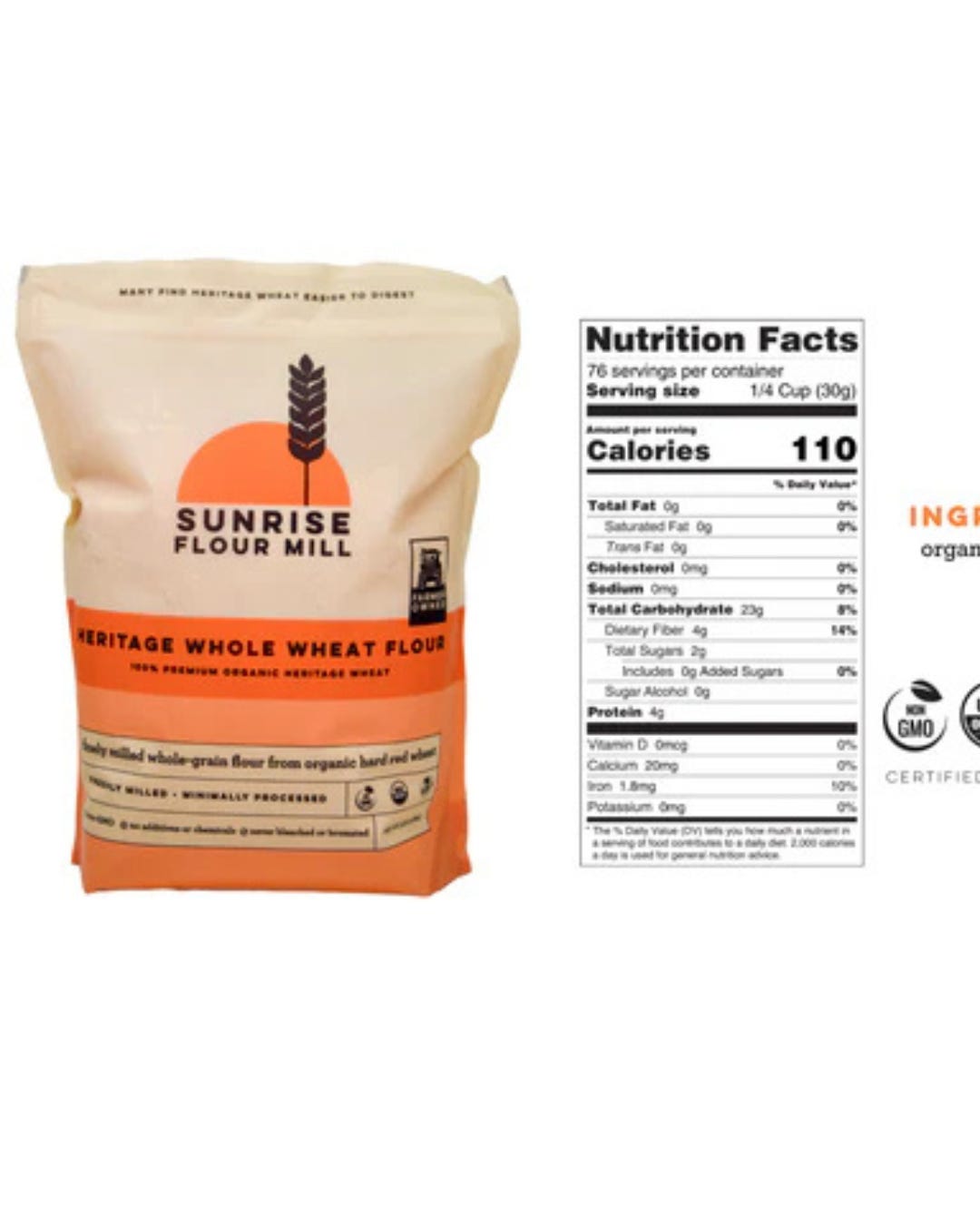 Sunrise Flour - single source, organic, heritage flours using a renewed milling technology from the 1930’s called the Unifine mill. It is a single pass, high velocity impact mill. Instead of grinding the grain, the mill shatters it into very minute particles, a technology that produces a super-fine and fluffy flour.
